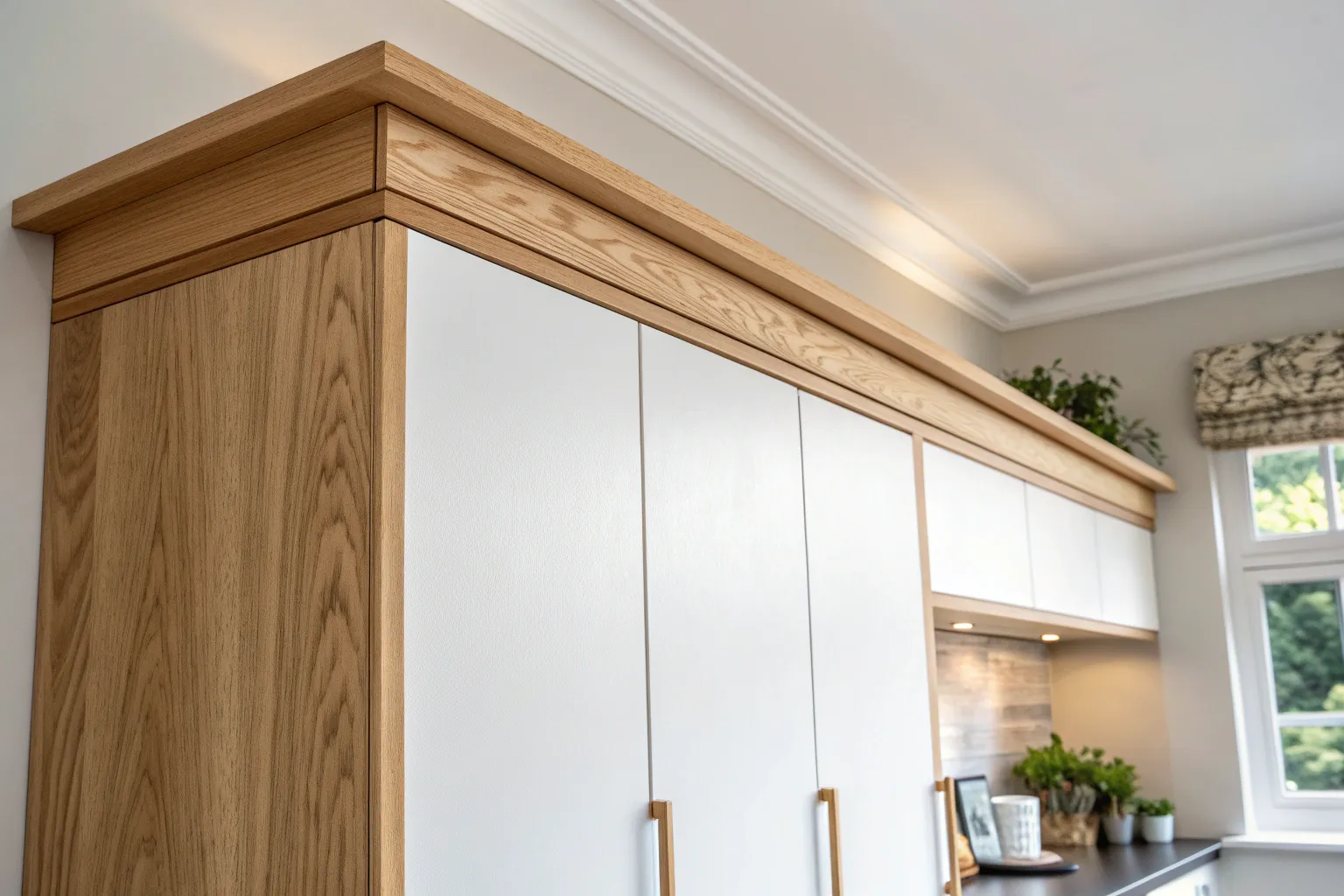 To create the illusion of a thicker, solid canopy like in the photo, rip a 4- to 6-inch strip of oak plywood. Attach this vertically to the bottom front edge of the soffit, extending downward. This acts as a valance that hides under-cabinet lighting and visually connects the soffit to the cabinetry.