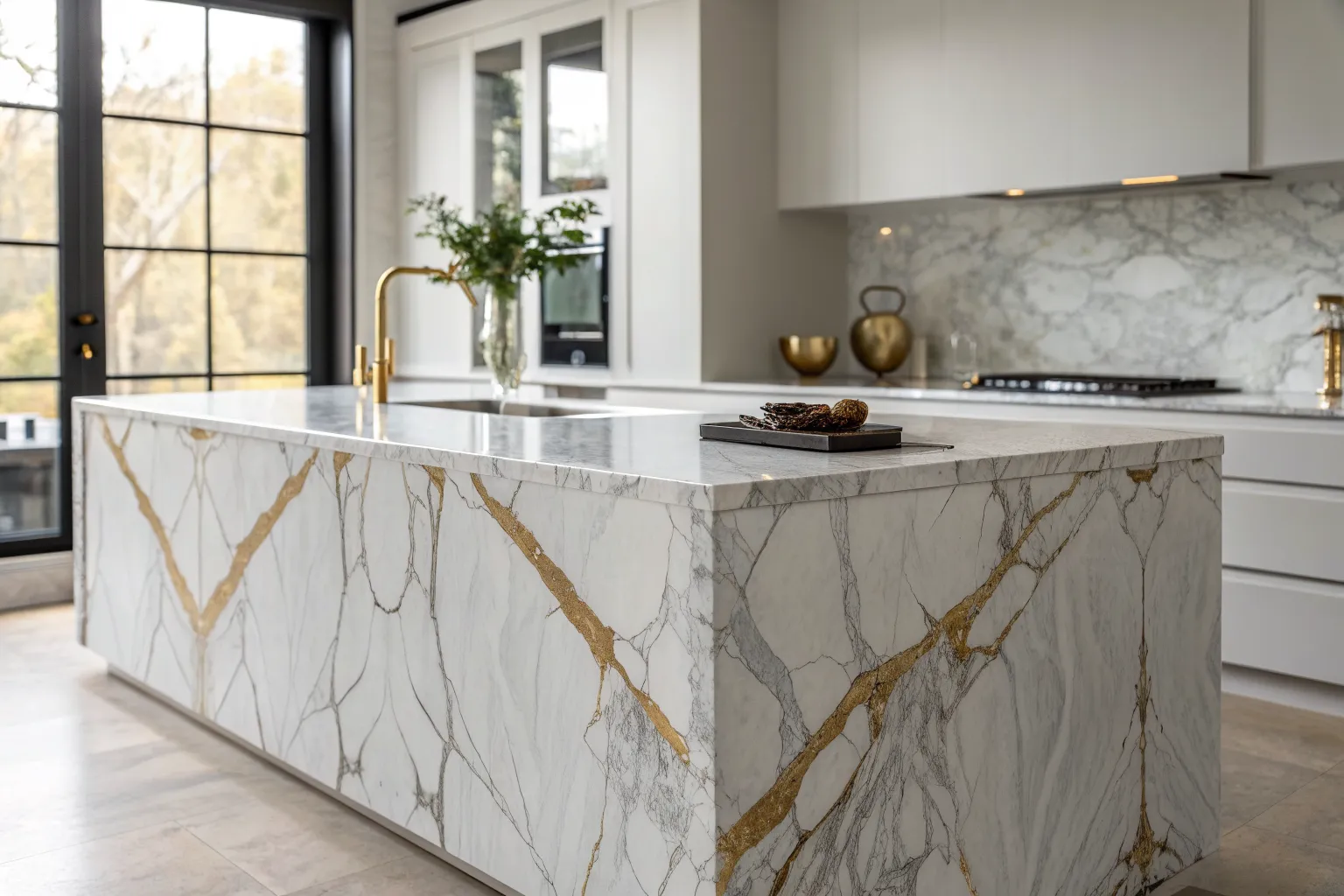 Achieve the luxurious look of a high-end kitchen remodel by installing a marble-effect quartz countertop with a matching full-height backsplash. This project brings brightness and sophisticated texture to your space using durable, engineered stone.