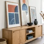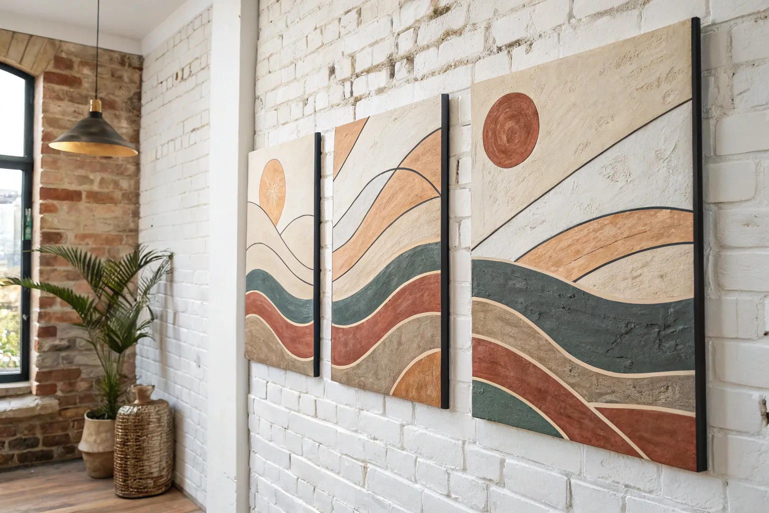 Build or buy light wood floating frames (like ash or maple) for each canvas. The wood tone complements the terracotta paint and adds a high-end gallery finish.