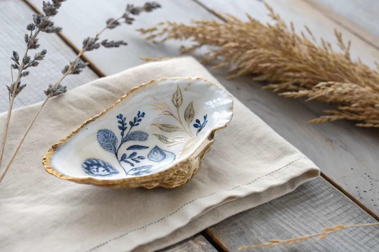 Transform a humble oyster shell into a piece of faux fine china with this elegant decoupage project. Using the classic blue-and-white aesthetic of Delftware or Chinoiserie, you’ll create a sophisticated trinket dish that looks hand-painted but uses a clever paper napkin technique.