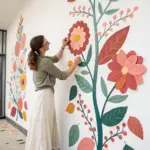 While the green is still slightly tacky or just dry, take the deep olive paint and add shading to the underside of the leaves and the bottom of the stems. This adds dimension and prevents the mural from looking flat.