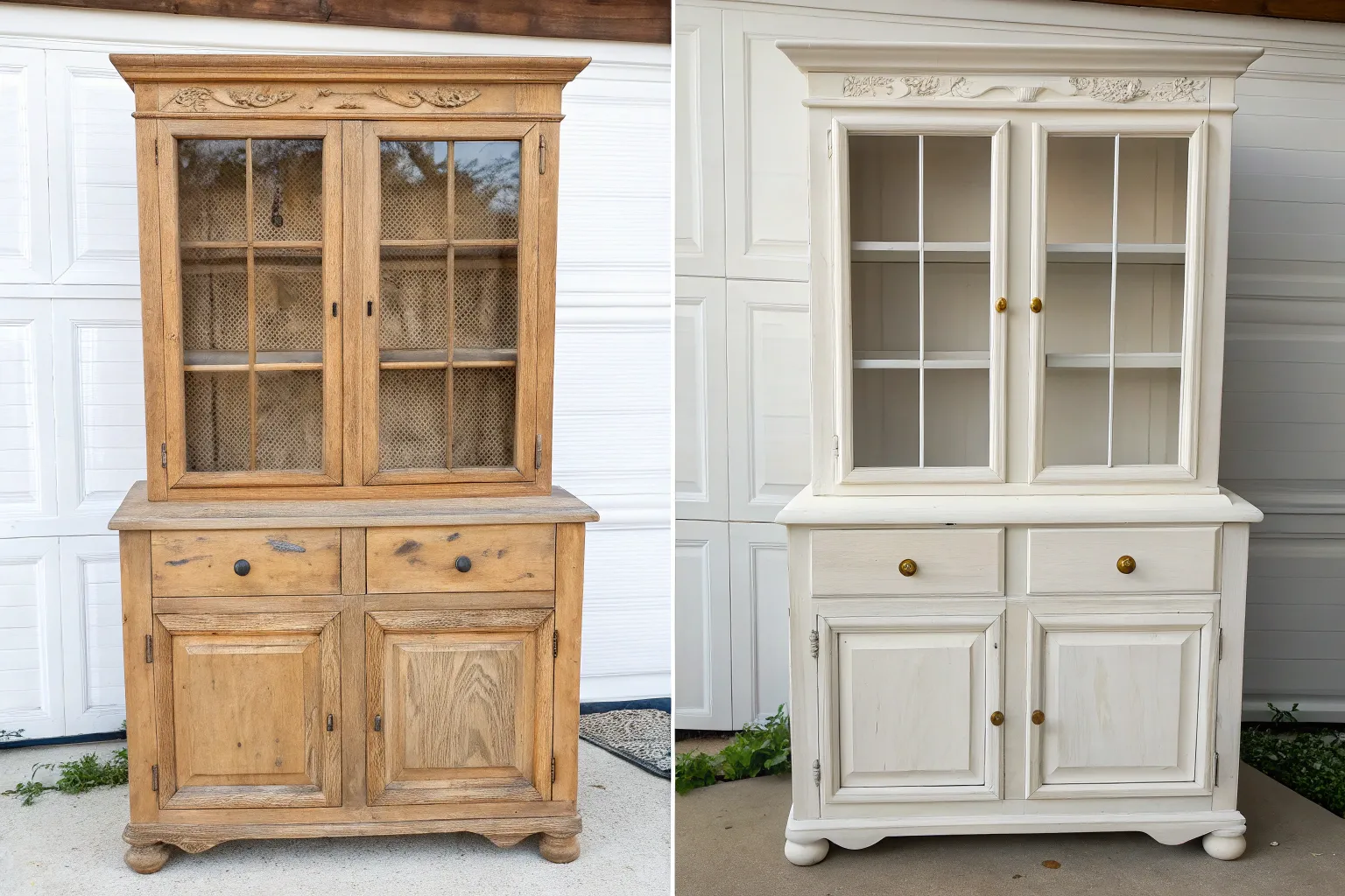 Classic before and after: wood hutch transformed to crisp white, softly styled in warm window light.