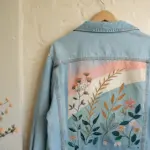 Using a white chalk pencil or disappearing fabric marker, lightly sketch your composition. On the left leg, plan a large focal bloom near the hem with vines reaching upward. On the right leg, place the main flower slightly higher or lower for an asymmetrical, organic look.