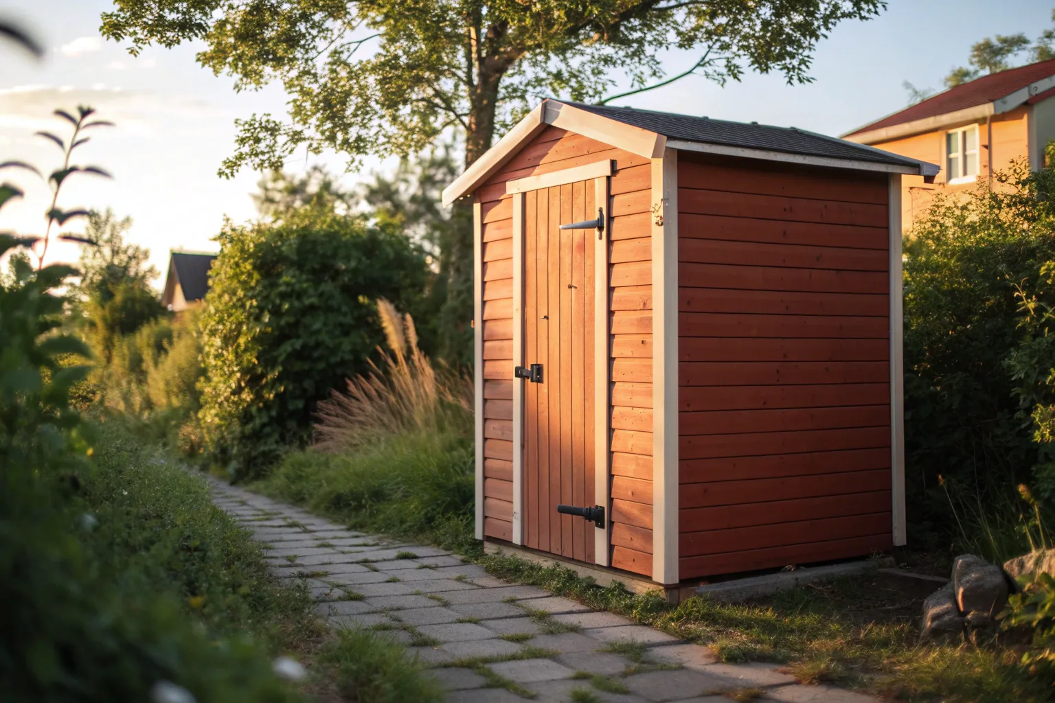 Transform a standard backyard structure into a charming garden retreat with this classic two-tone paint scheme. The soft beige siding paired with crisp white trim creates a timeless look that feels both inviting and sophisticated, perfectly complementing natural landscaping.