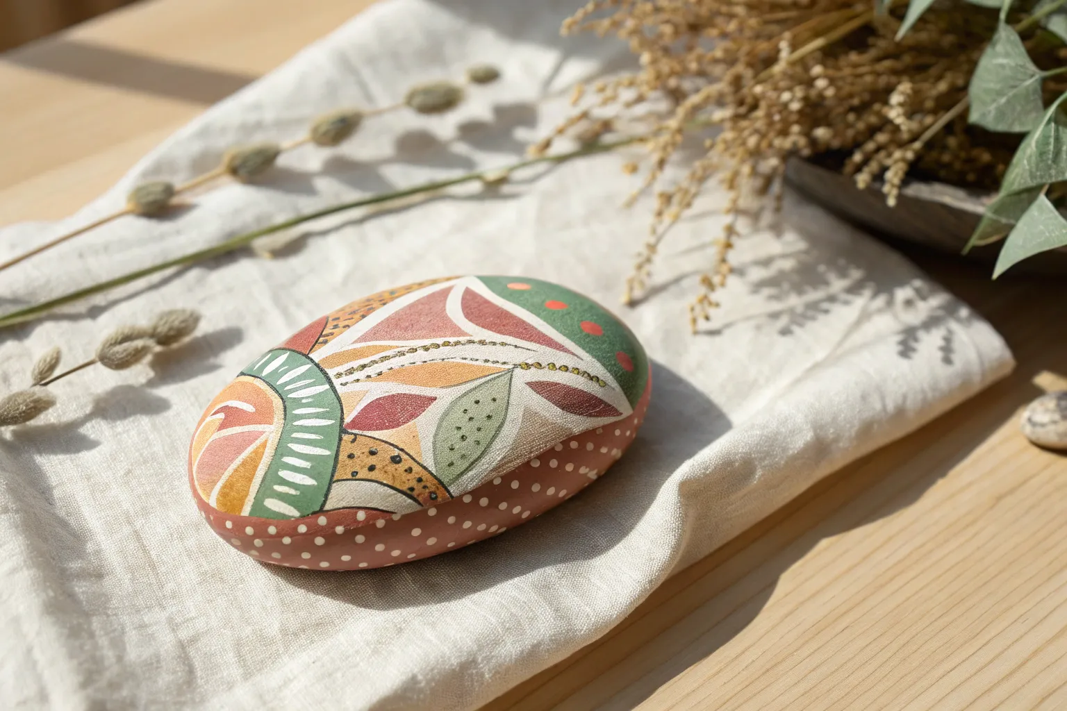 Transform a smooth river stone into a delicate piece of home decor with this folk-art inspired design. Featuring earthy tones of rust, sage, and cream, this painted rock uses simple strokes to create a sophisticated, organic pattern.