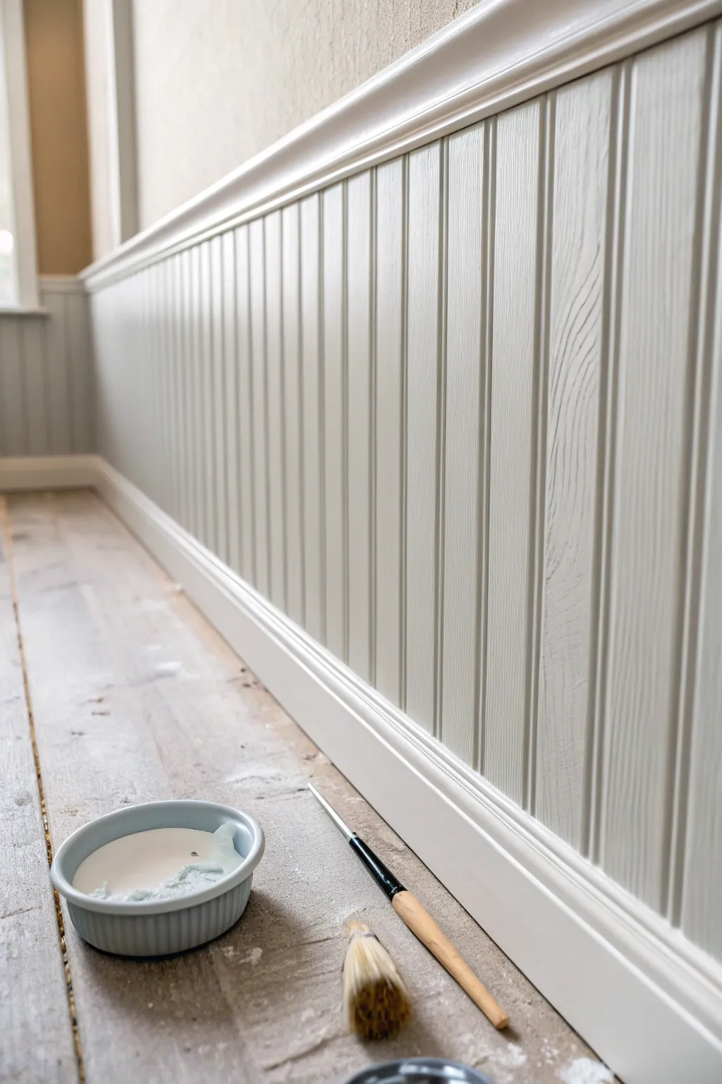 With a steady hand, pull the brush straight down the groove. Use the physical shape of the beadboard recess to guide your bristles—let the wood do the work of keeping you straight.