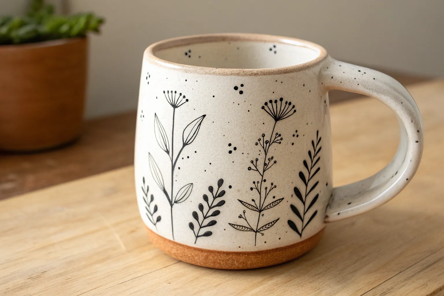 Embrace the rustic charm of speckled pottery with this elegant yet simple vine design that climbs organically around your mug. The contrast between the creamy white glaze and the exposed raw clay bottom creates a grounded, earthy aesthetic perfect for your morning brew.