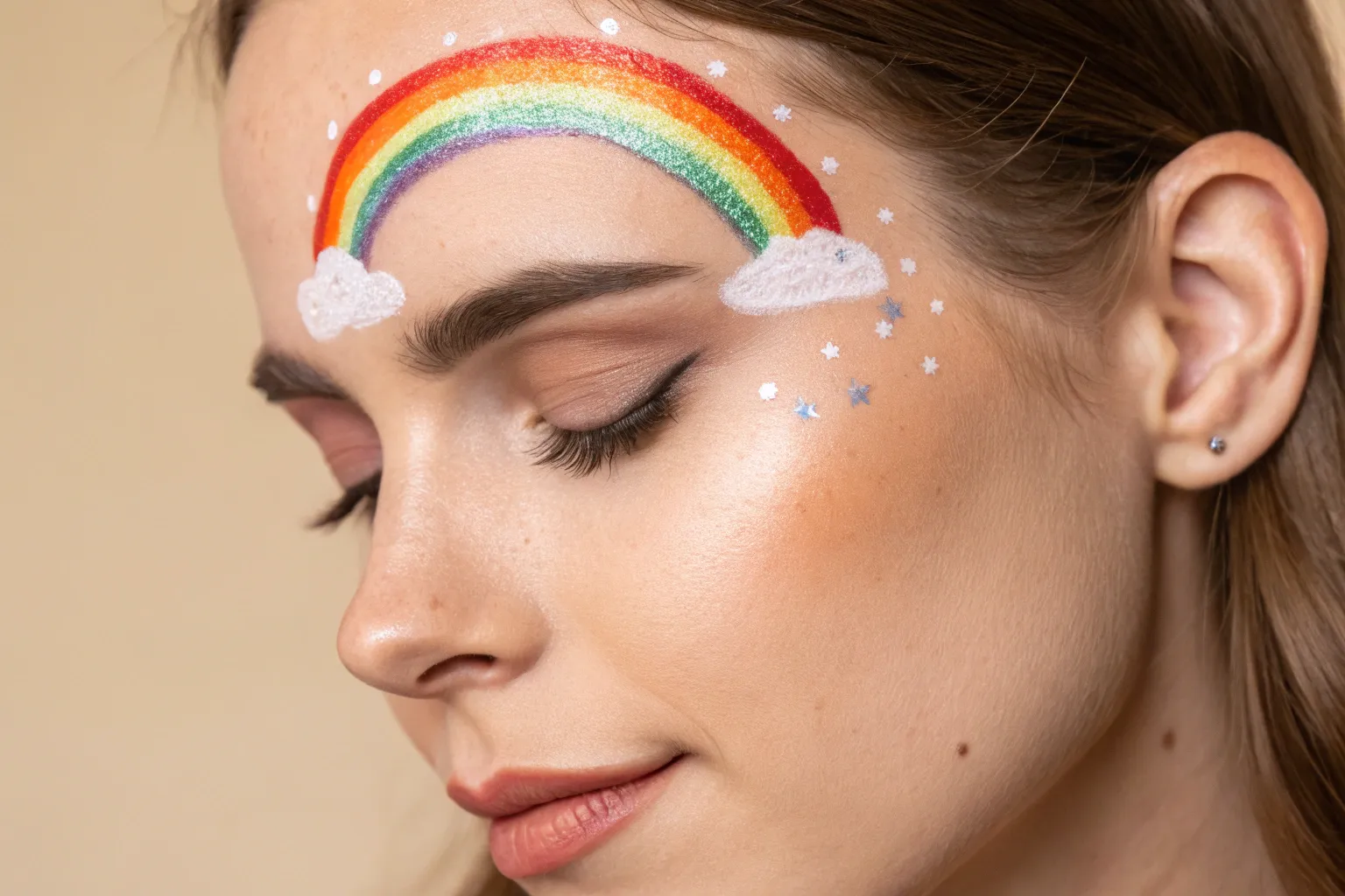 This elegant take on rainbow face paint moves beyond the standard full-face designs, focusing on a delicate sweep beneath one eye anchored by a fluffy cloud. Paired with warm, shimmering eyeshadow, it creates a dreamy, festival-ready look that highlights your natural features.