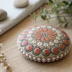 Transform a smooth river rock into a whimsical night garden scene with this elegant botanical design. The contrast of delicate pastel foliage and coral stars against a deep charcoal background creates a magical, dreamy effect that is surprisingly simple to achieve.