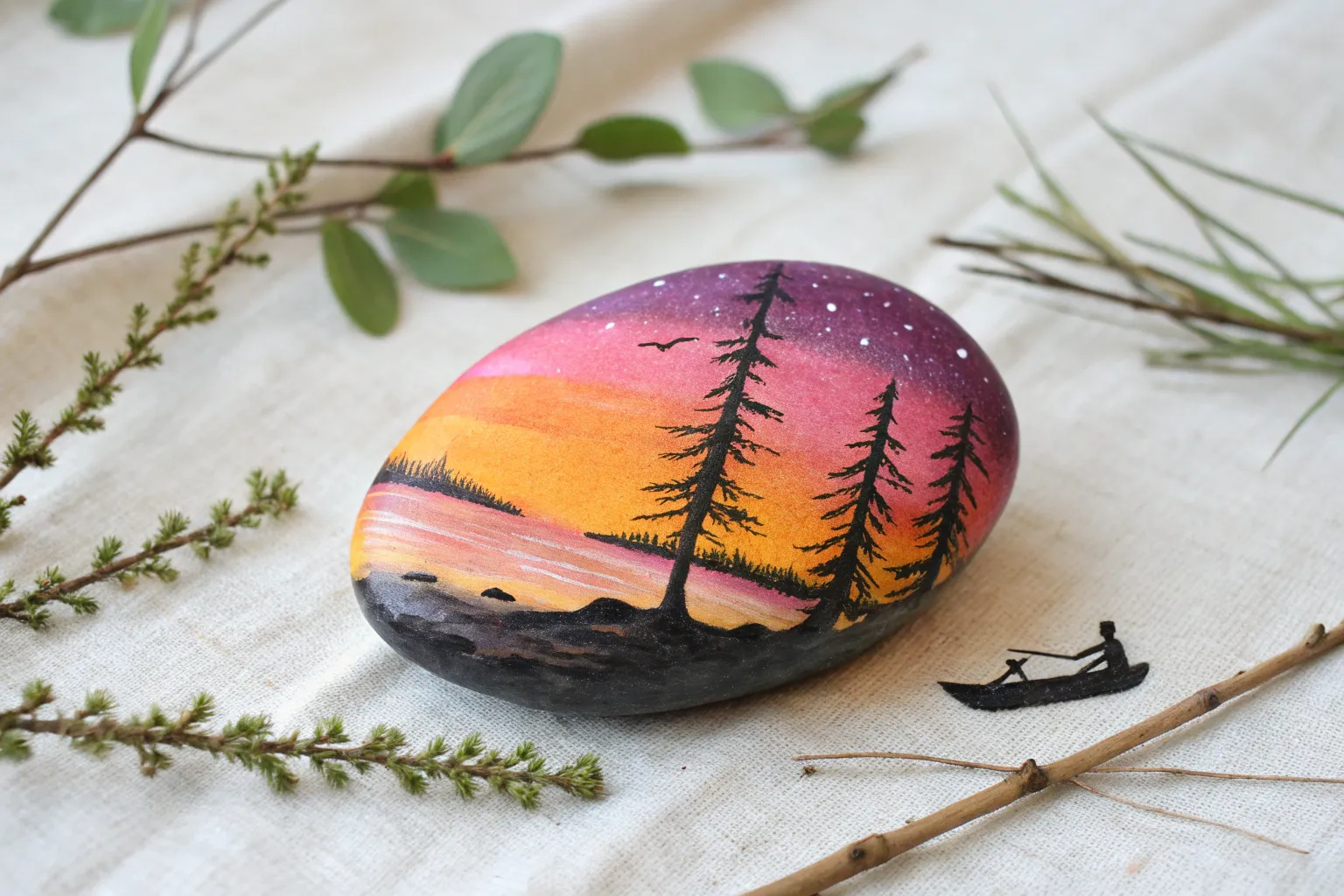 If you love those glowing end-of-day skies, sunset rock painting is the perfect tiny canvas to chase that feeling. I’m sharing a mix of classic silhouettes and more playful twists so you can find a sunset rock idea that fits your mood.