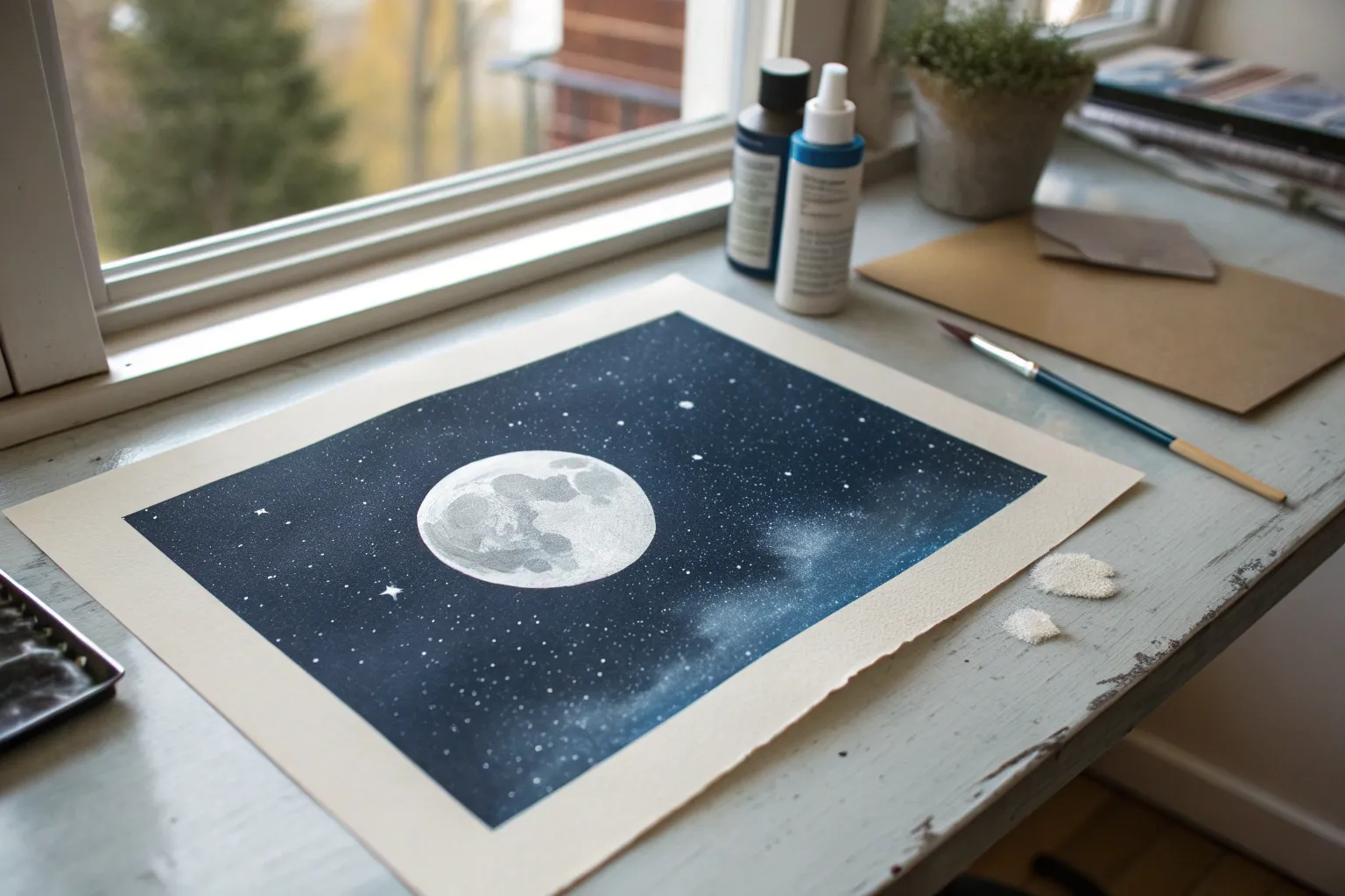 For the large blue moon at the bottom, we need specific craters. Place small bottle caps or coins onto the wet paint surface. -