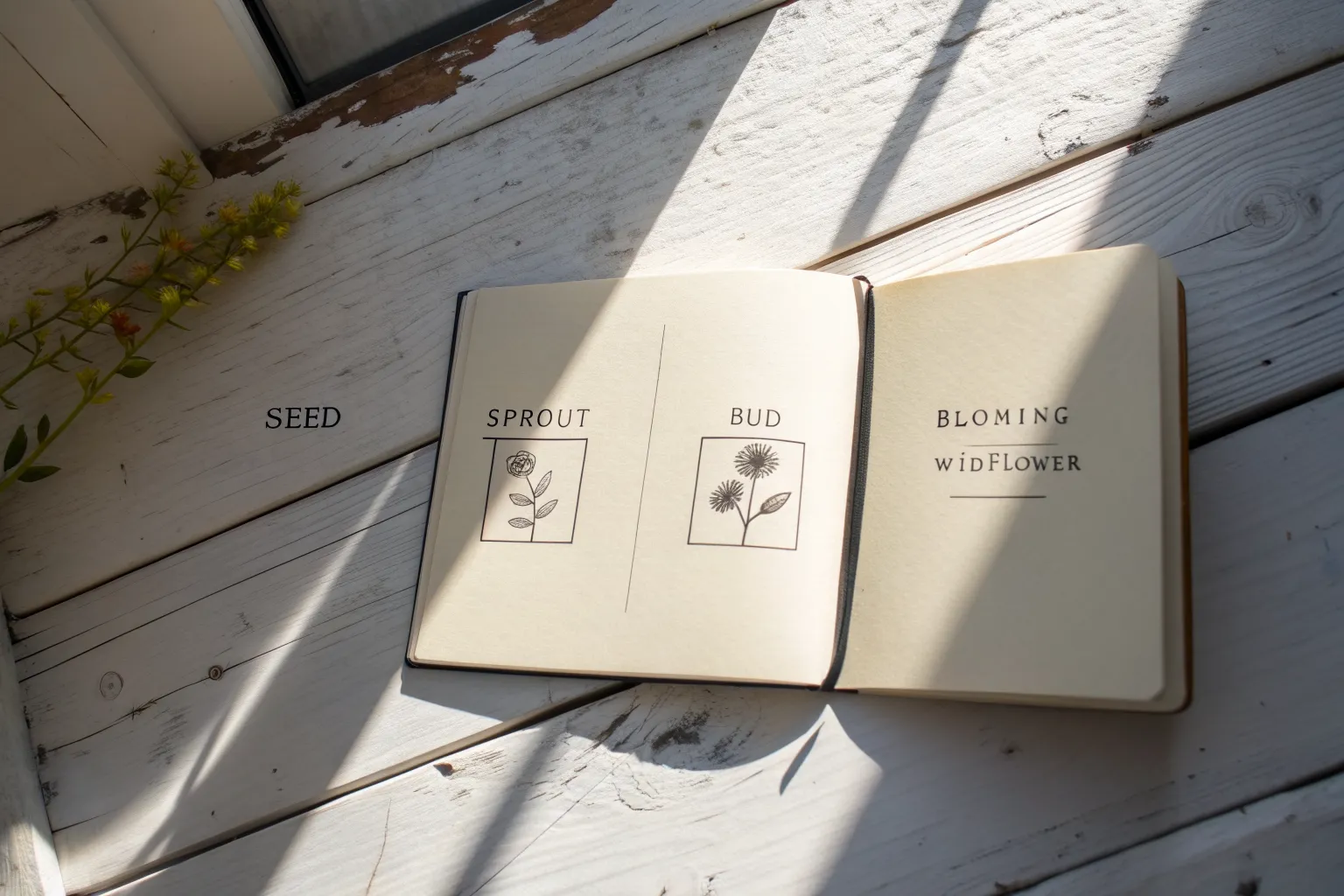 In the bottom-left panel, dedicate this space to flora. Sketch a detailed branch with leaves or flowers, like the clover-style plant shown. Keep the lines delicate to differentiate it from the landscapes. -