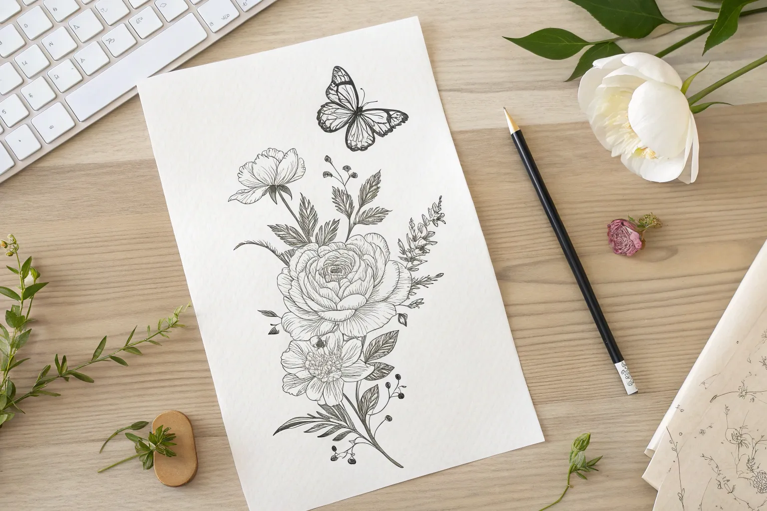 Capture the delicate beauty of a botanical tattoo design with this fine-line ink illustration. This project combines bold outlines with intricate shading techniques like hatching and stippling to create a timeless floral bouquet.
