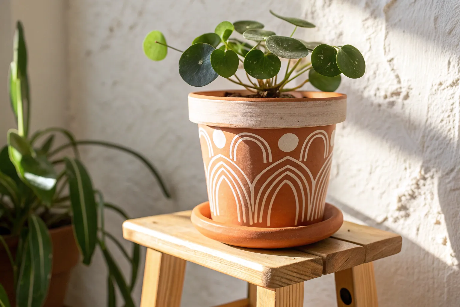 Bring a touch of modern bohemian style to your plant collection with this high-contrast design. By utilizing the raw clay color as a background for crisp white geometric shapes, you create a striking vessel that looks perfect with succulents.