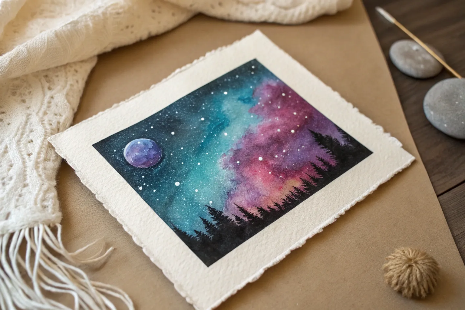 If weird watermarks appear, you likely added water to a drying wash. Don’t fight it! In nebula paintings, these ‘mistakes’ actually look like realistic gas textures.