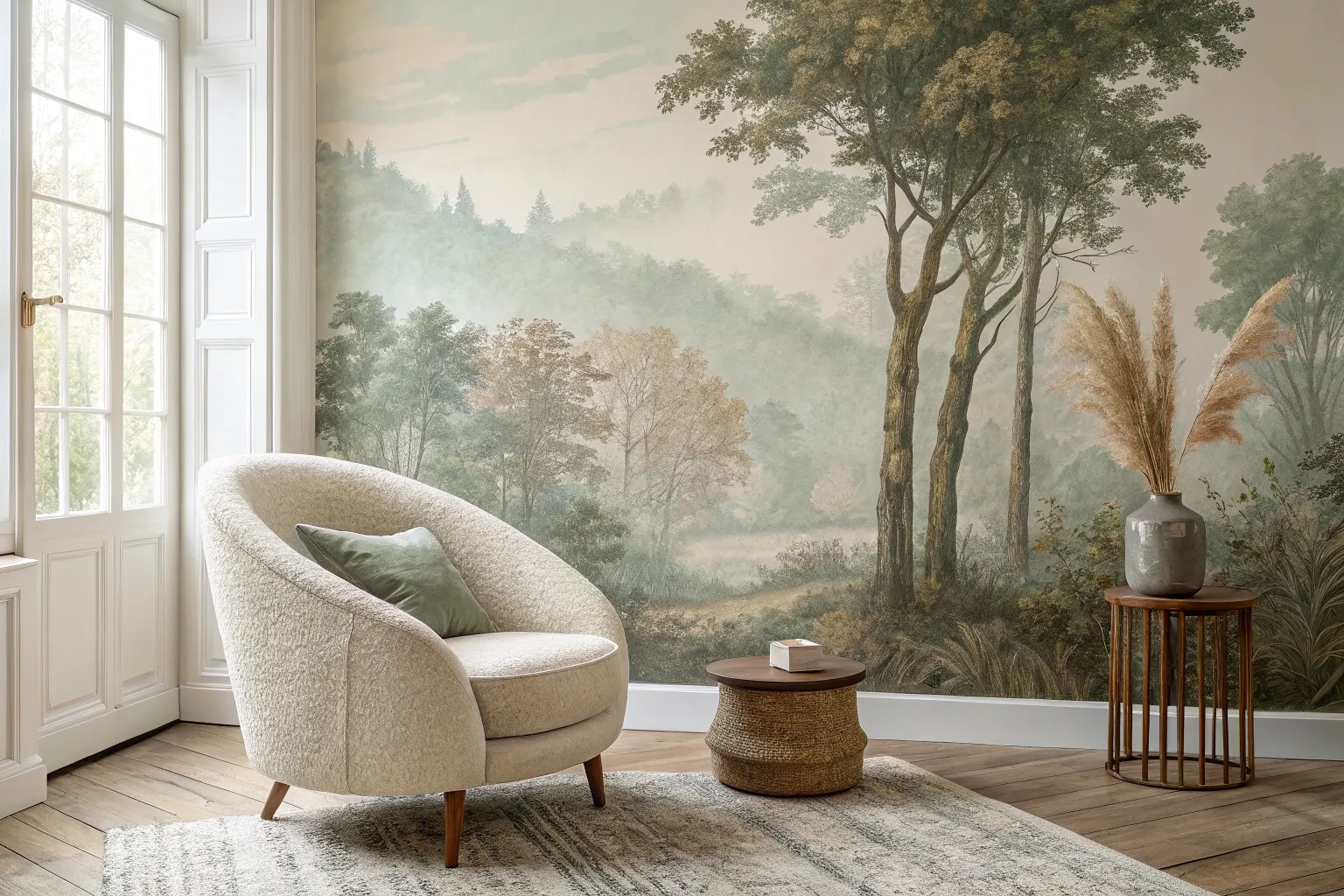 Style your new mural with natural wood furniture and dried grasses to complete the look.