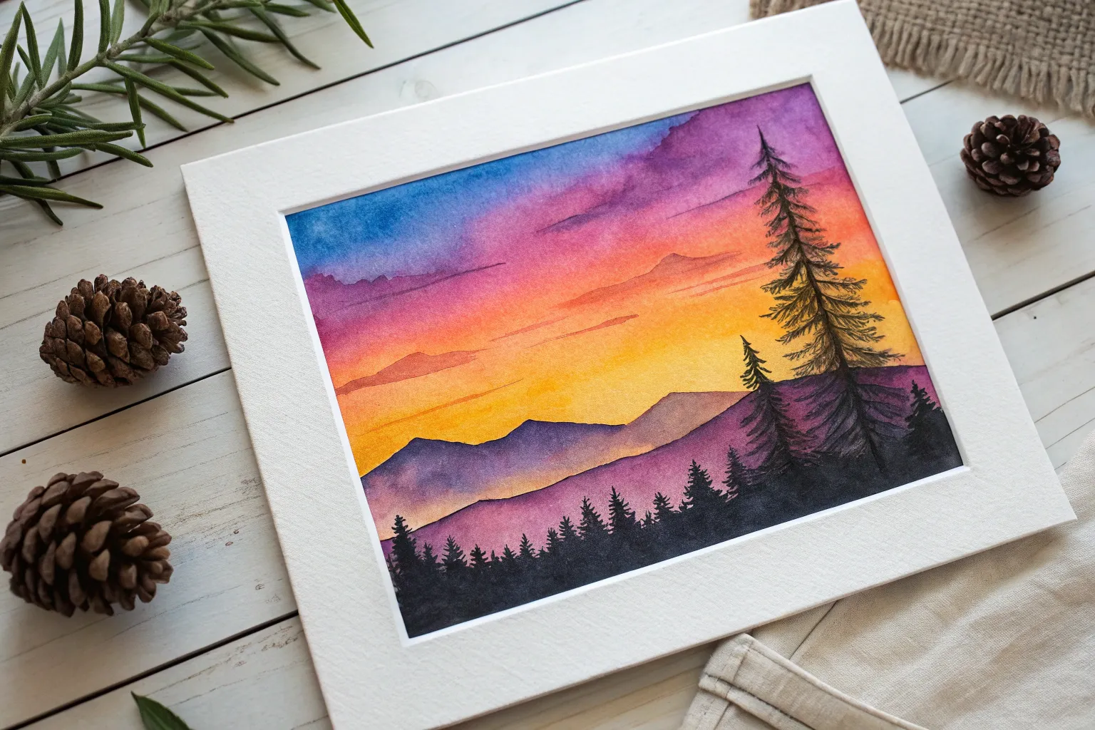Add a thin line of metallic gold watercolor right along the horizon line or on the water’s edge. It catches the light beautifully when framed.
