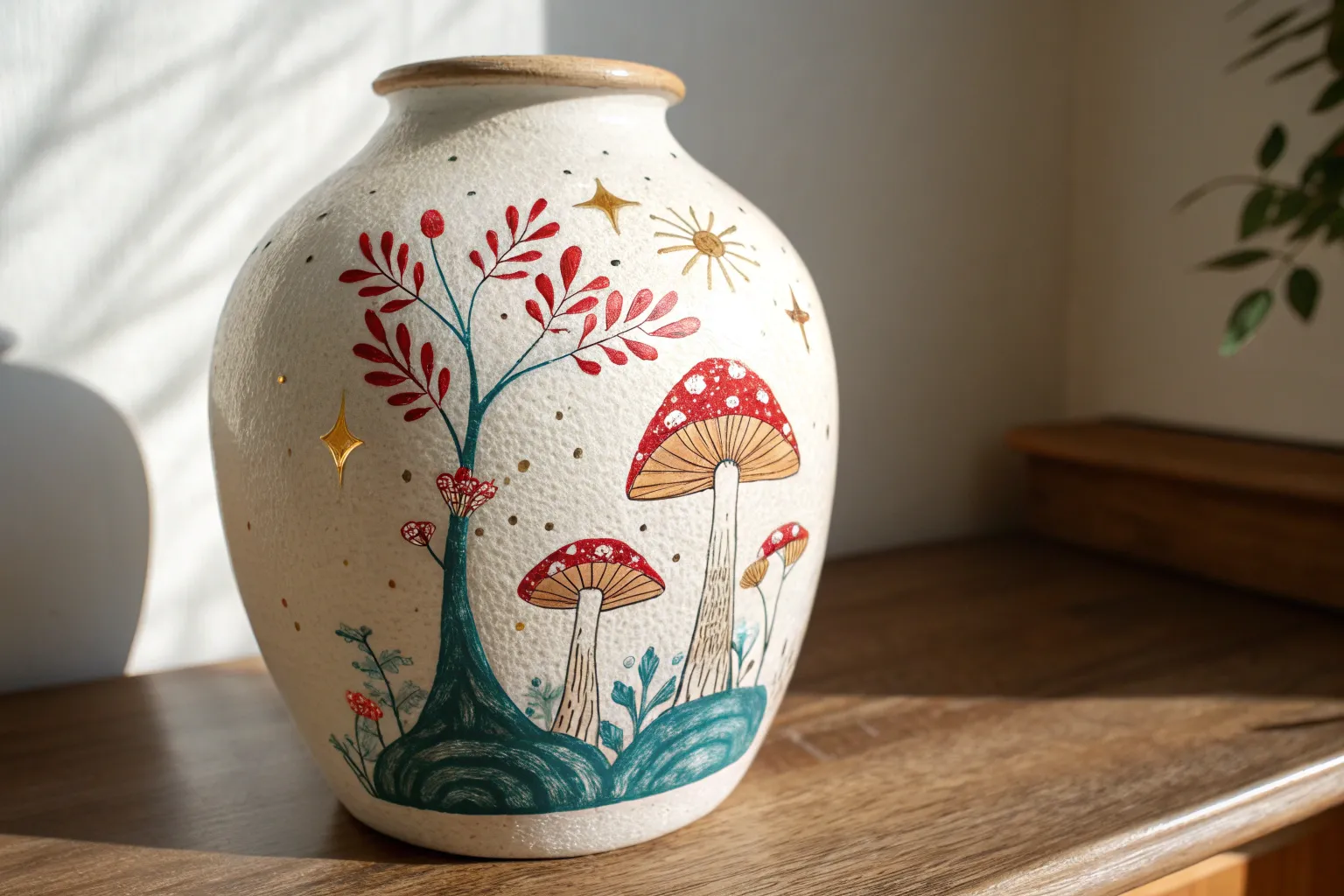 Use white gouache or a white gel pen to add tiny specks (the universal veil remnants) on top of the large mushroom cap. You can also add a few highlights on the edge of the skirt. -