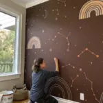Roll on two coats of your deepest indigo paint for the top portion of the wall. This creates the ‘night’ backdrop. Ensure the paint gets deep into the mortar grooves for solid coverage. -