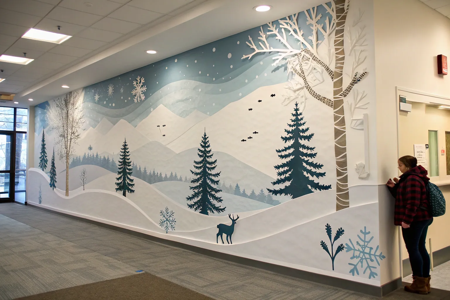 Transform a plain cinder block wall into a breathtaking snowy landscape featuring a deep blue starry night and a layered pine forest. This project uses stylized geometric shapes and a limited color palette to create depth and atmosphere on a grand scale.
