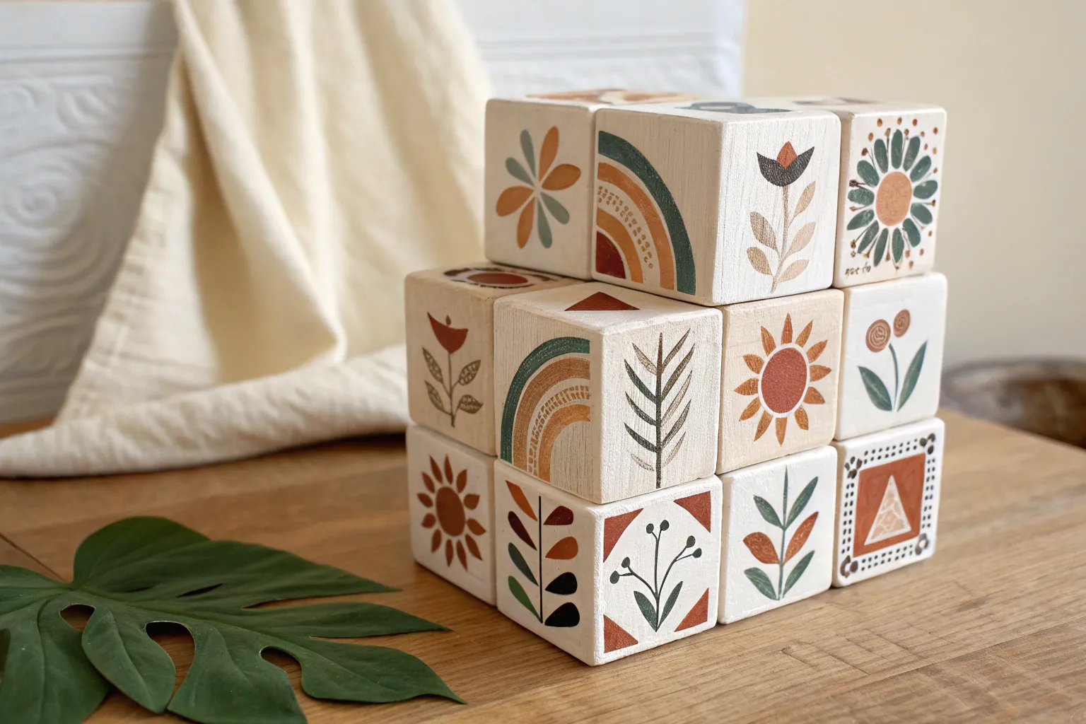 These stylish wooden blocks feature a warm, earthy color palette and sharp geometric lines that bring a modern boho touch to any shelf or play area. By using tape to create crisp triangles, you can achieve professional-looking results with just a few simple materials.